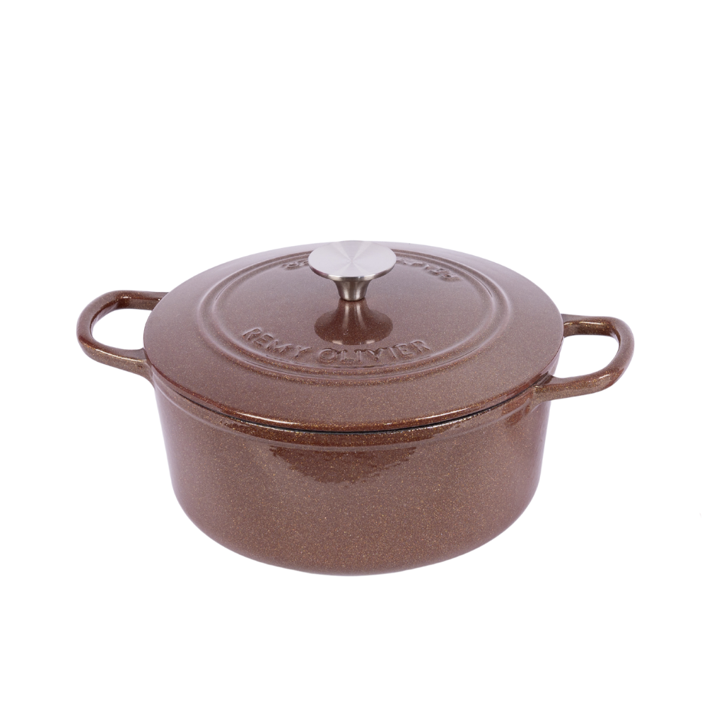 | 🎨 | Gold-Sprinkled Gradient Enamel Glaze | Features a unique coffee-colored base with a hand-applied gold sprinkling technique. Each pot boasts one-of-a-kind flowing textures, making it not just cookware but a collectible tabletop art piece. |